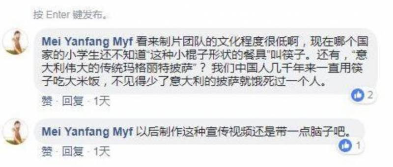 令人感到奇怪的是,一位男士在旁白中用字正腔圆的普通话说道:“今天我们首先要向大家展示,如何用这种小棍子形状的餐具,来吃意大利伟大的传统玛格丽特披萨。”