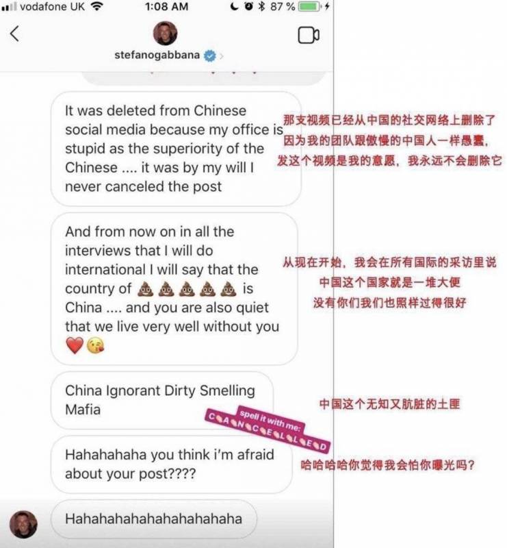 这位设计师先是对D&G先前发布的辱华视频进行争辩,随后恼羞成怒,破口大骂:“i will say the country of is China...”(中国是一个屎一样的国家),“没有你们我们也照样过得很好。”在对话的最后,他还表示自己不怕被曝光。