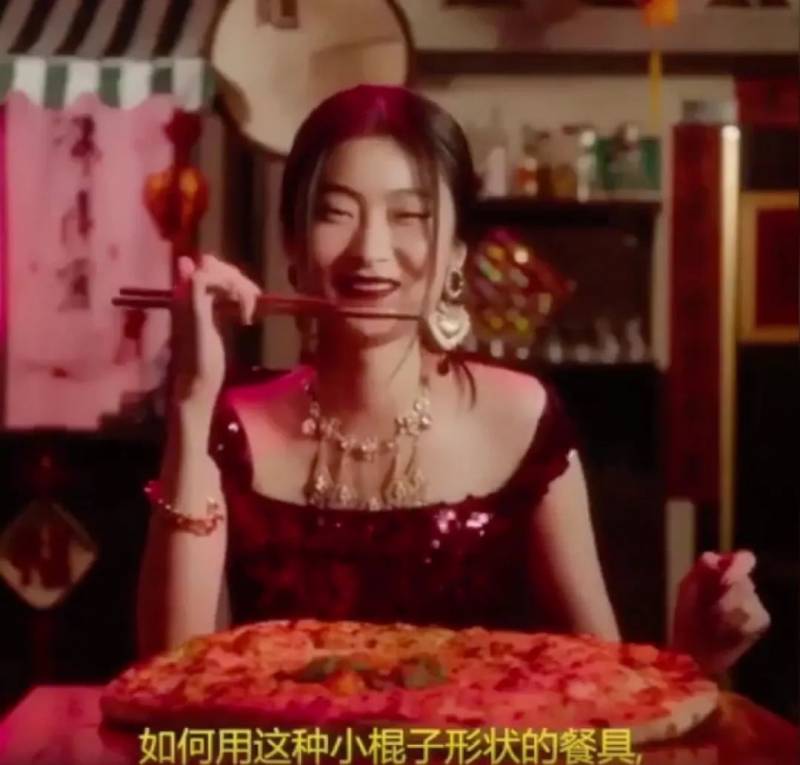 在视频中,一名中国女模特用筷子吃披萨、意大利甜卷、意面,这本没什么问题。