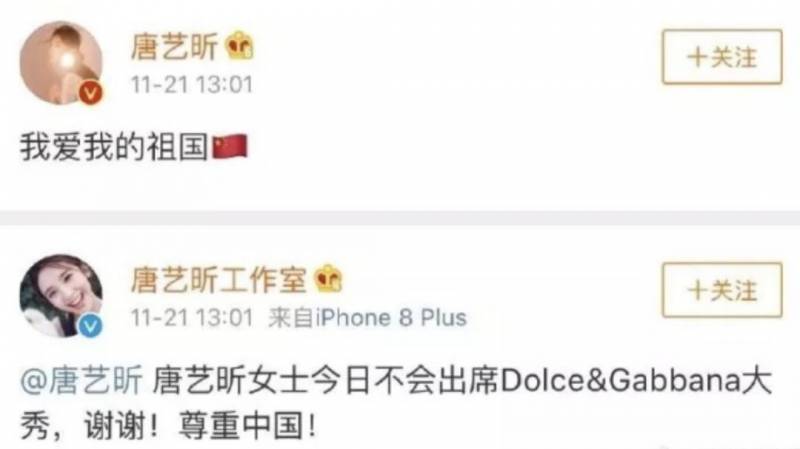 唐艺昕和其工作室也表示不会出席大秀。