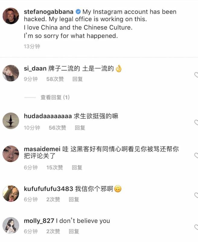 架不住网络上的舆论,设计师本人在Instagram上发文称:我的ins账号被盗了,我爱中国和中国文化,对于发生的事我感到十分抱歉。