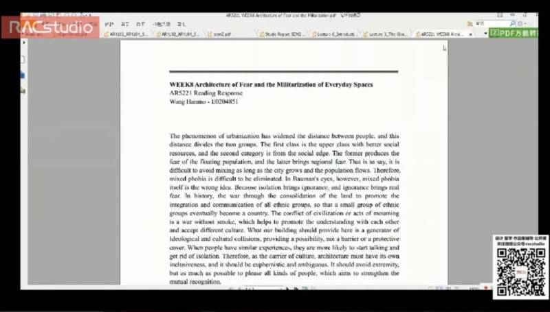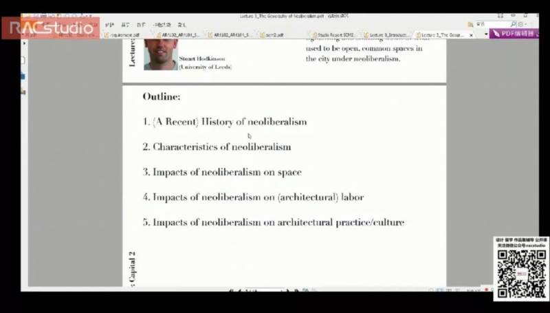 比如什么是资本主义,它不单讲建筑,金钱资本,相当于城市建设的动力。每周免费给一些书籍,这门课最后要交一份超过3000字的论文,总共是十周,从里面任意选一个喜欢的话题,写阅读回应,做一个PPT给大家展示。