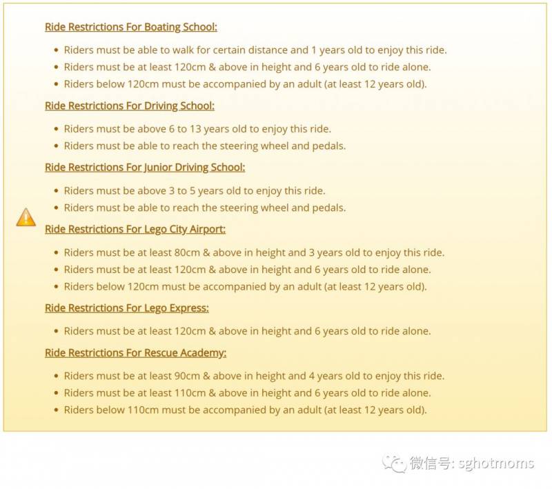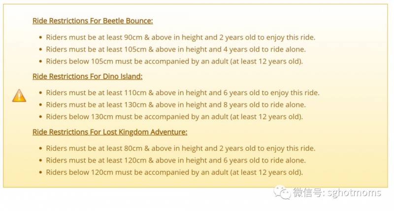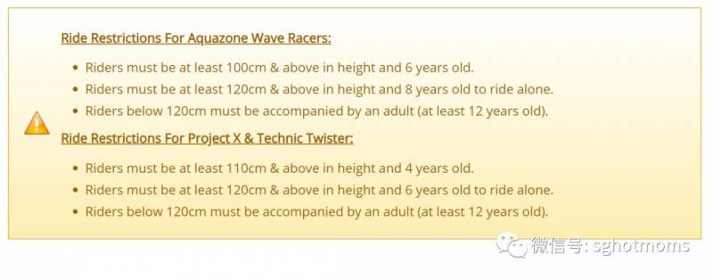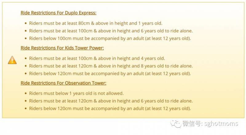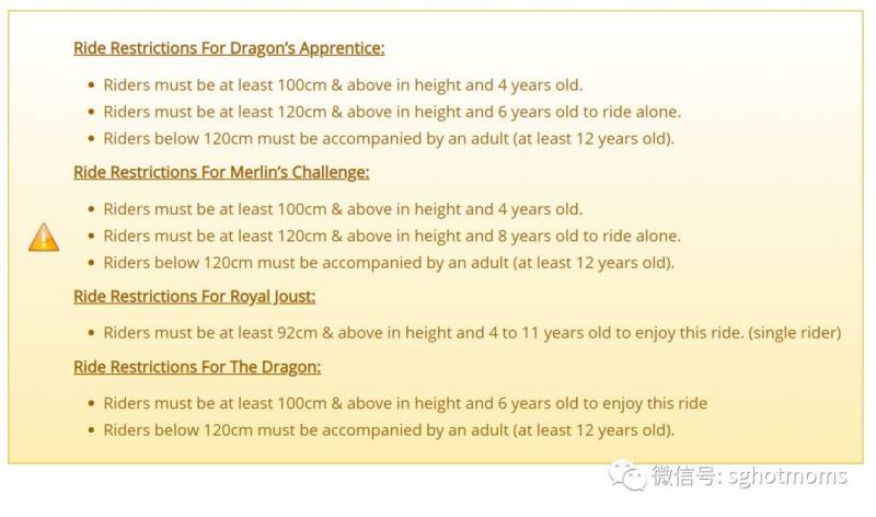 不要忘记本节中的游乐设施,特别提到骑行项目X ,适合120厘米及以上儿童的过山车,以及低于成人陪伴的要求。