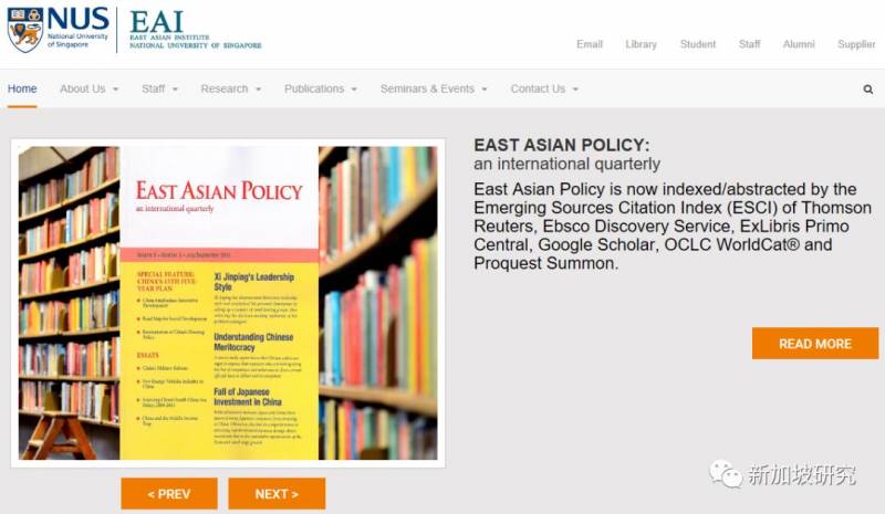 据2015年的QS全球高校排名, 新加坡国立大学 (National University of Singapore缩写为NUS) , 为全球第12位, 亚洲第一位。作为全球著名的一流高校, NUS的EAI作为新加坡的官方智库, 在国际上享有盛誉。东亚研究所 (EAI) 成立于1997年4月。东亚研究所前身可追溯到1983年由新加坡副总理吴庆瑞博士 (Dr Goh Keng Swee) 所建立的东亚哲学研究所 (Institute of East Asian Philosophies) 。1992年东亚哲学研究所更名为东亚政治经济研究所 (Institute of East Asian Political Economy) 。1997年, 东亚政治经济研究所又易名为东亚研究所, 这个名字沿用至今。这一研究所迄今为止已经成立20年, 成为新加坡和全球知名的研究所和智库。新加坡东亚研究所成立于1997年4月, 隶属于新加坡国立大学, 是新加坡主要的中国学研究机构。其研究重点最初是中国的儒家思想, 随着中国改革开放的深入, 其研究内容也有所变化, 目前主要研究中国和东亚国家的政治、经济与社会发展问题。