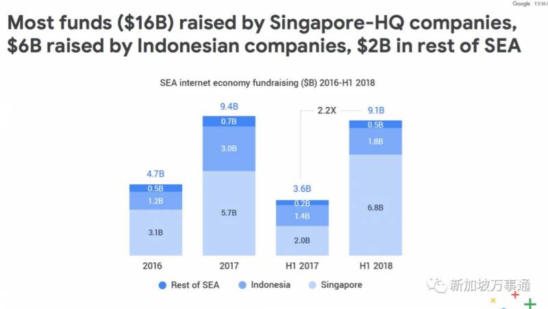 2018年东南亚互联网企业的融资额将会创下新高,上半年已经融资91亿美元,等于2017年全年融资金额。而2016年至今,东南亚总计完成融资240亿美元!报告显示,2016年-2018年期间以新加坡为总部的互联网公司,融资额度最大,高达160亿美金,新加坡吸引融资的能力远超其他5个经济体,占比超过总融资额的一半以上;其次是印尼的互联网公司,实现了60亿美金的融资;其余的几个东南亚互联网公司仅仅实现了20亿美金的融资。