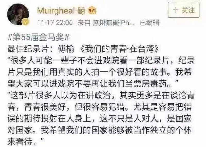 不了解情况的小伙伴可能一头雾水,原来在今年的金马奖颁奖典礼上,一部叫做《我们的青春,在台湾》获得了最佳纪录片奖,但是该纪录片的导演傅榆(中国台湾)上台发表获奖感言的时候,却公开表达了台独言论。