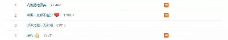 关注度最高的就是巩俐拒绝颁奖,直接冲到了微博热搜榜第一。