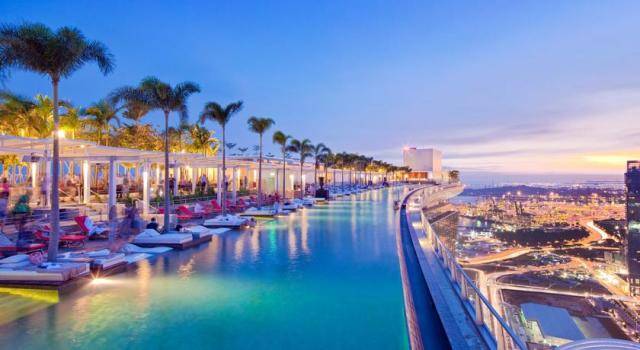 滨海湾金沙酒店的露天泳池,最吸引人眼球的地方莫过于它的高。150米长的游泳池,位于200多米高的酒店顶层,是全球最大的室外无边际游泳池。这里不仅能尽情游弋,还能享受绿意盎然,鸡尾酒陶醉,三座滨海湾金沙酒店顶部的空中花园俨然是一座空中的世外桃源。