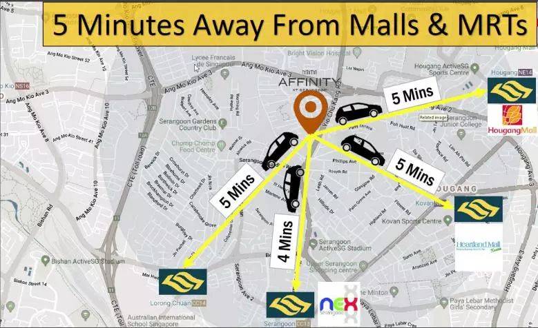 众所周知,实龙岗Serangoon属于成熟住宅区,约5分钟车程到实龙岗地铁站、高文地铁站、后港地铁站、罗弄泉地铁站,商场如东北部最大的NEX Mall, 有NTUC超市,商场,百货,银行,食阁,餐馆,电影院,图书馆等,还有Heartland Mall, Hougang Mall等。