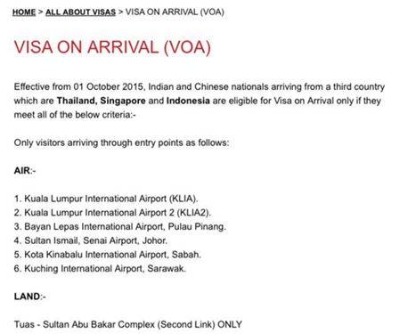 从泰国/新加坡出发去马来西亚的中国公民,可以申请落地签,护照上必须有有效的泰国/新加坡多次往返签证