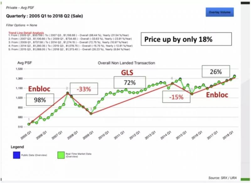 从近15年的房价来看,虽然中间有短期周期性波动,总体呈现出上升的趋势,从2005年至今,新加坡房价整体已经翻了一番。