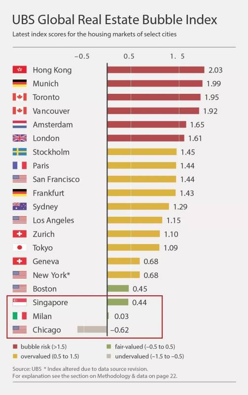 在瑞银集团(UBS)公布的最新一期“全球房产泡沫指数”中,评分最低的三个城市分别是芝加哥、米兰和新加坡,而香港高居榜首。其他存在泡沫风险的城市包括:香港、慕尼黑、多伦多、温哥华、伦敦和阿姆斯特丹。