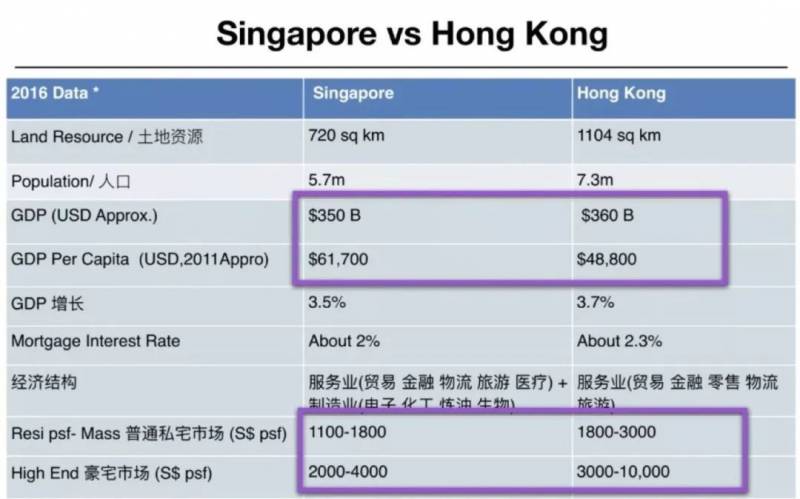 而目前香港住房价格约等于香港家庭中位数年收入的19倍,新加坡仅为5倍。香港黄金地段目前的最高尺价是新加坡每平方尺的4-5倍,新加坡的GDP增长率却比香港更高。这也就意味着新加坡房产的升值空间要比香港高得多。