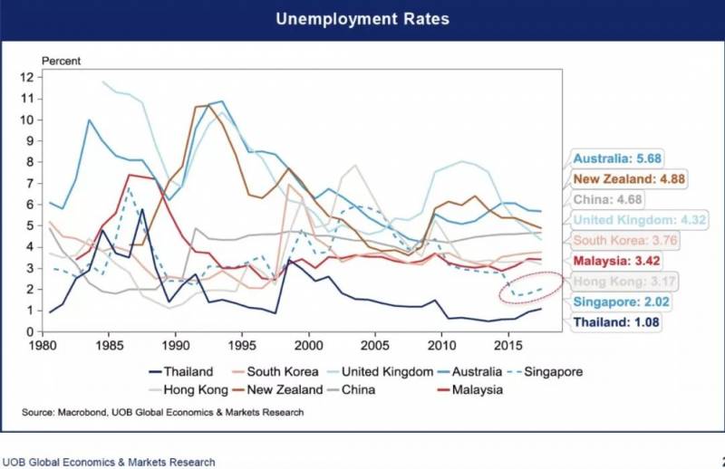 新加坡一向以低失业率闻名,常年维持在1.9%-2.2%之间,低失业率确保了经济和住房需求的稳定。
