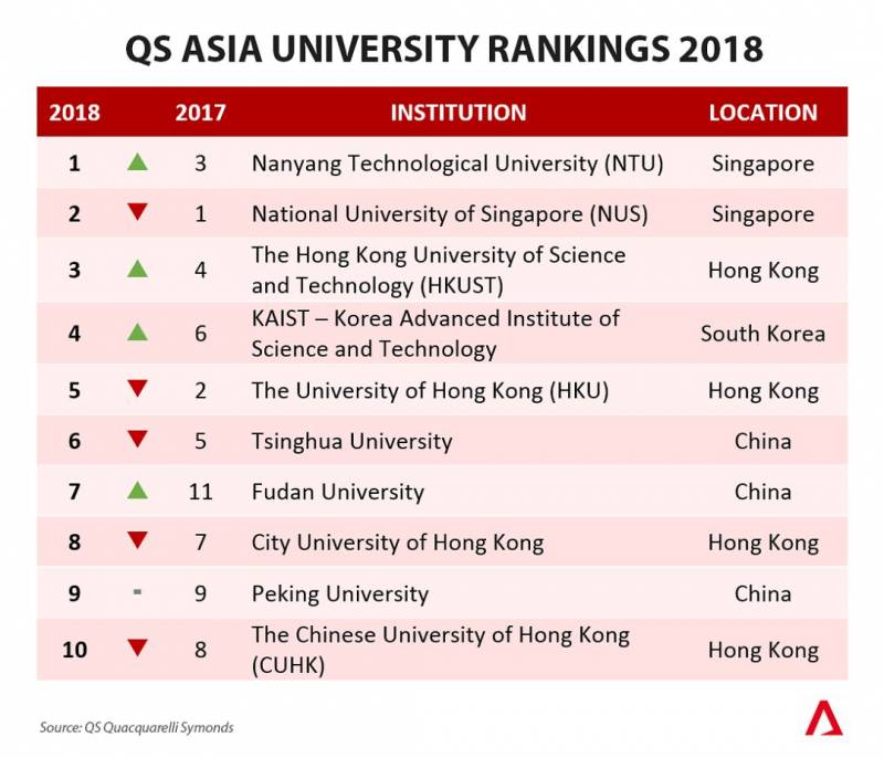 新加坡拥有两所亚洲最顶尖的学府:新加坡国立大学(NUS)和新加坡南洋理工大学(NTU)。泰晤士高等教育在2月7日发布了亚洲大学排名,NUS连续第三年登顶,清华大学、北京大学分列其后。而在2018年的QS亚洲大学排名中,NTU和NUS分获第一、第二名。