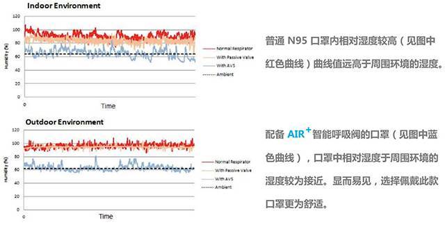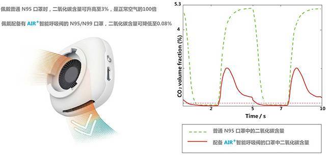 而且比普通 N95 的口罩中 3% 左右的二氧化碳含量(正常空气的 100 倍),AIR+口罩使用呼吸阀之后只有 0.08%,长时间佩戴不会疼疼憋闷。