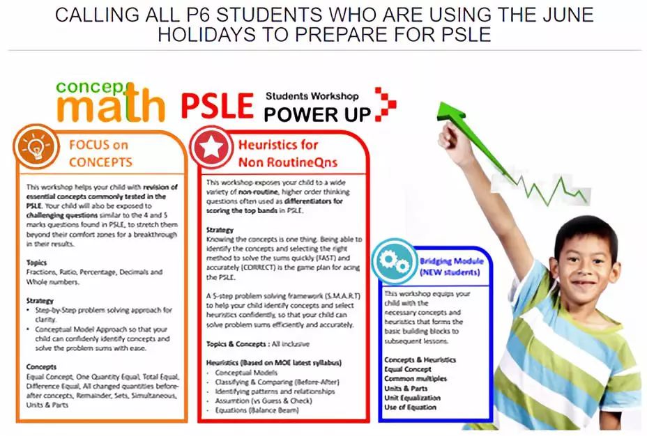 针对PSLE的小五小六学生补习,以英文和数学见长,据称学校保证补习后PSLE考试成绩会提高一个等级,无效退款