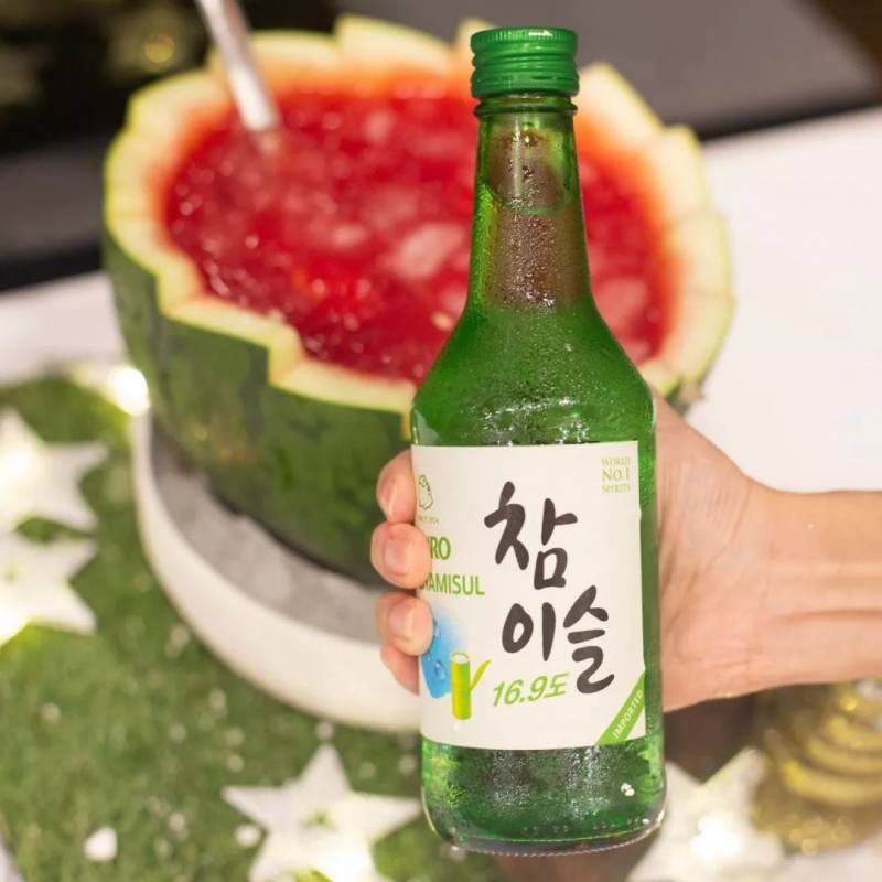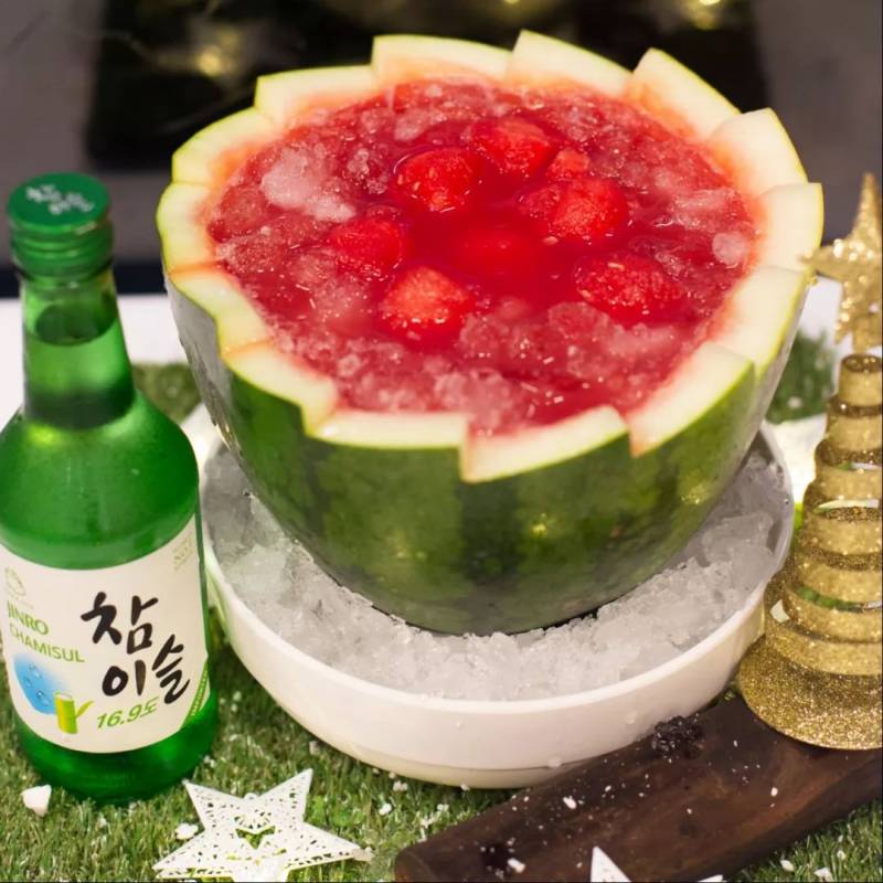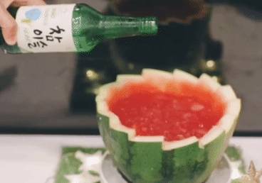 将韩式烧酒倒入新鲜西瓜中制成的“西瓜烧酒”,来搭配“火焰鸡”十分完美。