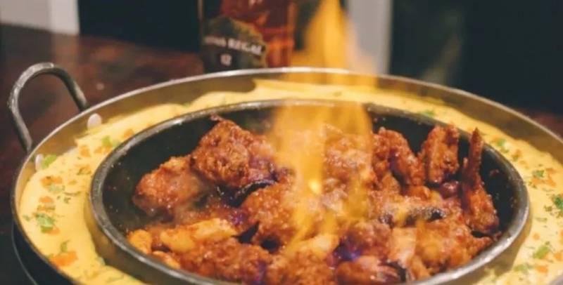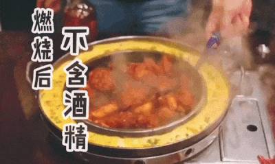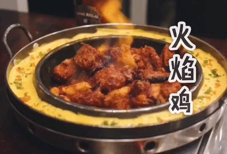 一点火,就能看到火苗在铁板上突然窜起,然后鸡块就着火了一样,变成了真正的“火鸡”啦。此时浓烟冒出,空气中也多了些鸡肉被烤制的焦香。待火苗熄灭后,鸡肉中的酒精也已经燃烧殆尽。鸡肉中只留下淡淡的酒香,而不会含有酒精哦。