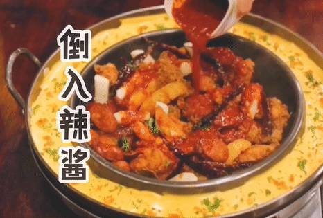 等铁锅烧热,店里的小姐姐就会倒入韩式辣酱,将铁板上的所有食物进行翻炒。木铲翻动间,辣酱的香味直往人的鼻子里钻。