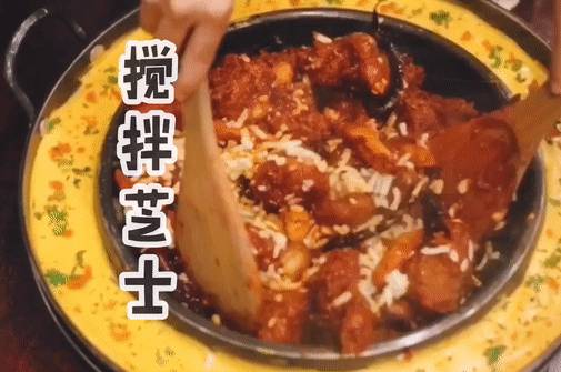 还没完哦,最后一步就是倒入切碎的芝士块,继续在锅中翻炒。芝士在刚刚燃烧过的食物上逐渐融化,在木铲上拉出条条细丝,十分诱人。芝士咸香的味道也缓缓释放出来。