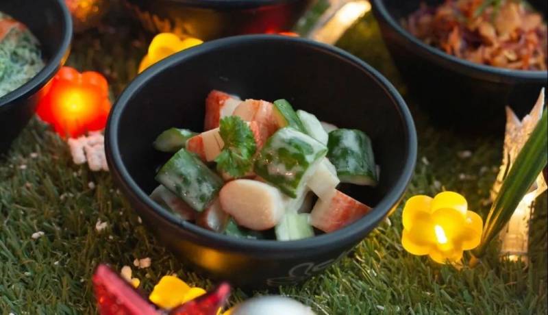 六种小菜包括蟹柳黄瓜、菠菜番茄、紫甘蓝、海草水晶粉、布鲁塞尔豆芽沙拉和韩式豆芽沙拉。每一份都精致又可口,十分清爽。