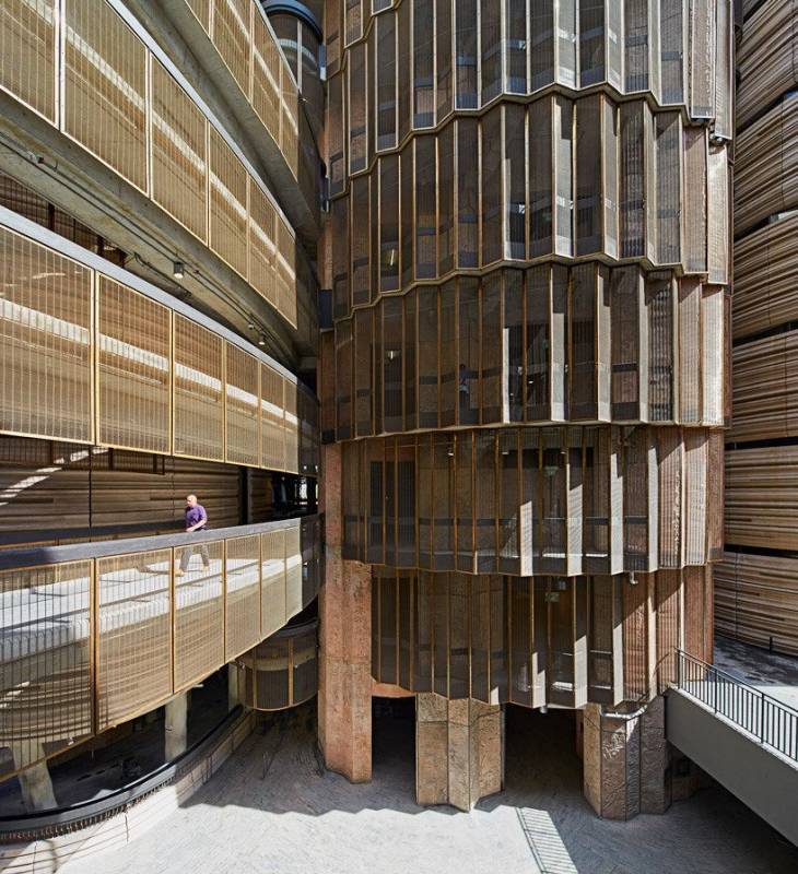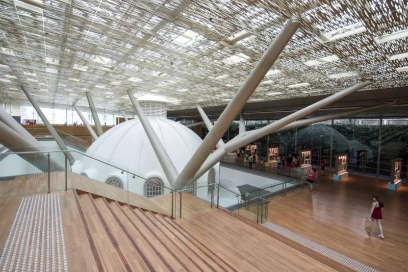 新加坡国家美术馆位于市政区中心,由新加坡历史上有着纪念意义的两所标志性建筑物——前市政厅和前最高法院大楼改建而成。Studio Milou采用壮观的树状钢结构支撑金属编织大屋顶,在中庭营造了一片波光粼粼的光影效果。