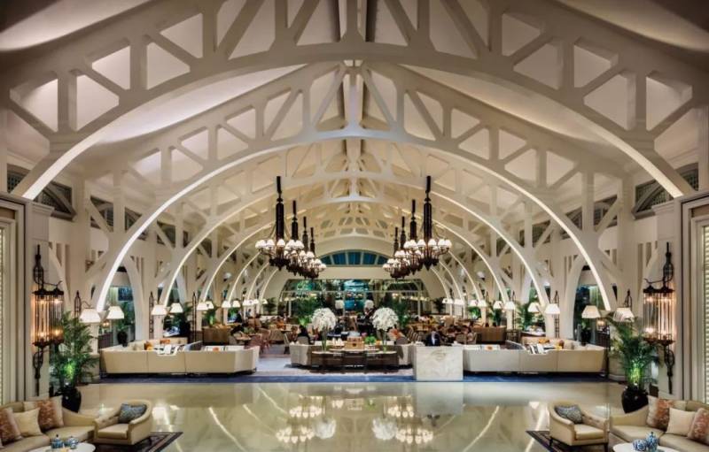海湾酒店是红灯码头的历史地标。红灯码头为新加坡早期移民的主要着陆点,码头上的红色灯笼为船员指引方向,名称由此得来。码头于2006年停用,后伴随富丽敦海湾酒店重新开放,原先的码头形态与大厅空间完美结合,别具时代记忆与历史韵味。