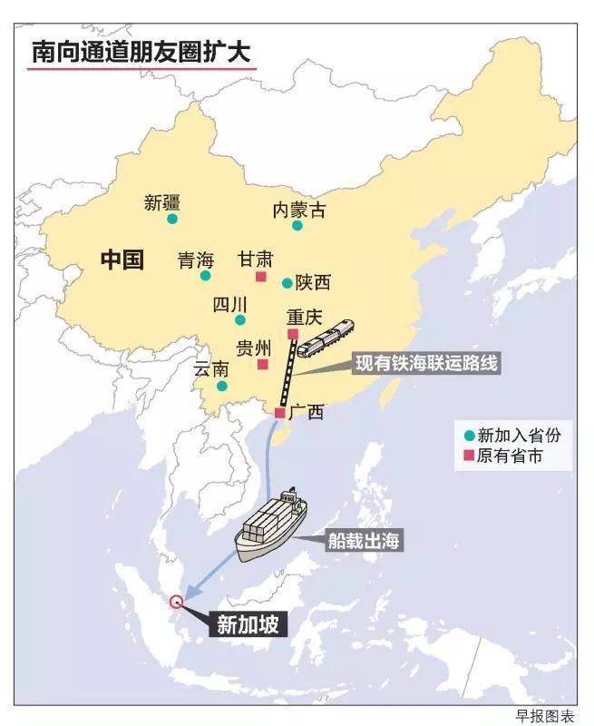 中新(重庆)战略性互联互通示范项目旗下的“南向通道”,正式更名为“国际陆海贸易新通道”(NewInternational Land-Sea Trade Corridor)。 “国际陆海贸易新通道”通过利用铁路、公路、水运、航空等运输方式,将中国西部省份的货物由重庆向南通过广西北部湾等沿海沿边口岸,通达新加坡等东盟主要物流节点。