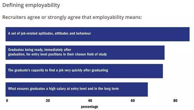 调研显示,超过80%的受访者明确表示,就业能力就是和工作相关的能力、态度和行为,比如团队合作力、沟通力、创新、时间管理等等都属于其中的一种。与此同时,他们也同意充足的相关领域储备知识也是优秀就业能力的外在体现。