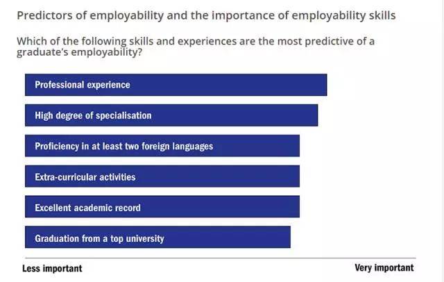 从上图可以看出,用人单位喜欢的就业能力中名校文凭、高等学位和优秀的成绩单占据了榜单的一半席位。同时上榜的还有外语能力和社会活动,其也被认为是就业能力。