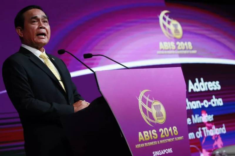 15日峰会闭幕仪式中,新加坡将会把东盟轮值主席国之位移交给泰国。图为泰国总理巴育在峰会期间发表演讲。