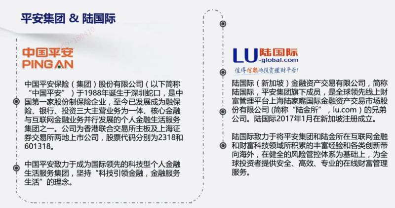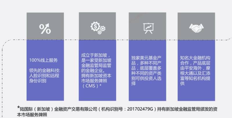 陆国际是中国平安集团旗下成员。2017年在新加坡注册成立并持有新加坡金融管理局(MAS)“资本市场服务牌照(Capital Markets Services License)”可为拥有海外银行账户及资产的投资者提供证券交易、资管服务及托管服务在内的一系列财富管理服务。