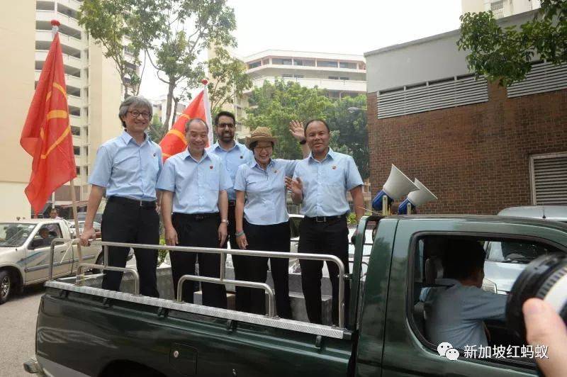 2015年大选。工人党五名候选人陈硕茂(左起)、刘程强、毕丹星、林瑞莲和莫哈默费沙,成功守住阿裕尼集选区,9月12日到实龙岗、巴耶利峇和后港答谢选民。(联合早报)