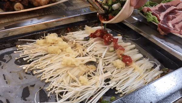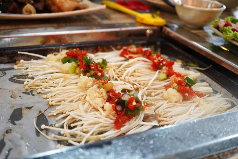 金针菇或者其他菇类放烤盘上烧烤。将蒜蓉铺在金针菇上,然后将小米辣、生抽、盐、油搅拌均匀,淋在蒜蓉上面。