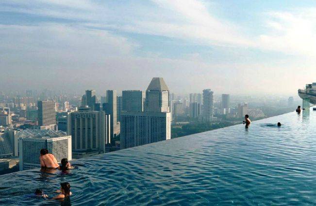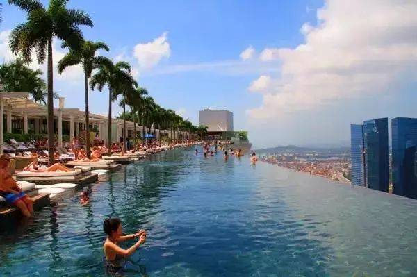 金沙酒店于2010年6月23日的举行盛大开业庆典。当天,这个耗资40亿英镑打造、拥有室外泳池、观光平台、豪华赌场等高档设施的度假酒店正式对宾客开放,最令人叫绝的是,宾客们可以在游泳的同时,俯瞰新加坡的城市景观。世界上最昂贵的酒店这个室外泳池建在滨海湾金沙酒店55层高的塔楼顶层,是奥运会泳池长度的三倍,高度为650英尺(198米),是这一高度下世界上最大的室外泳池。