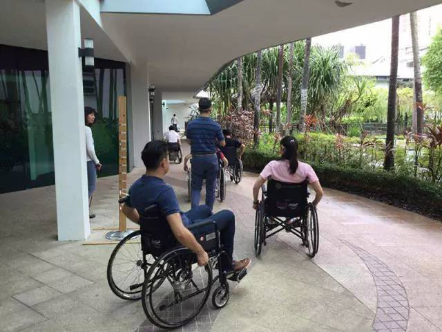 来到了学校的花园,在这里,有很多学生正在参加“残疾人体验”,这是学校的一个项目,为的是学生更好地了解盲人等残疾人的真正感受,从而在建筑设计中融入他们的理念。
