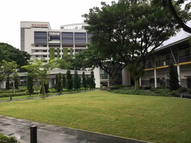 刚进学校大门,一片郁郁葱葱,远远就可以看到“BCA ACADEMY”几个大字。
