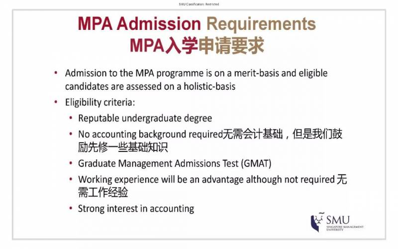 入学要求:需要gmat,合作院校同学可以用on-line test替换。考过CIMA等国际证书,是录取加分项。GMAT/IELTS/TOEFL最低要求为雅思6.5(雅思小分没有限制,口语能力可以用面试检验),托福90,GMAT一般需要650+(建议分数线)。如果本科是非会计专业,面试中不会有专业的会计问题。