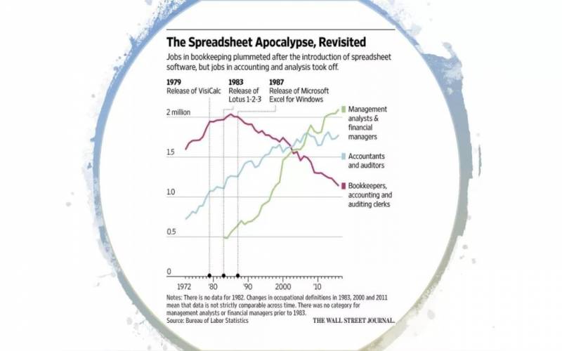 在上次电子工作表出现的时候,带来的变化是:记账员需求降低,管理分析/财务经理在不断增加,新的工种不断出现。
