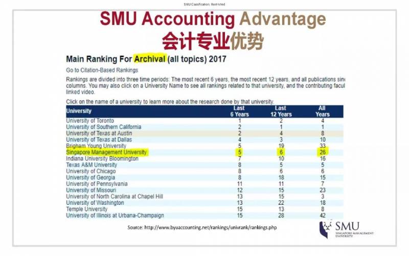 SMU是专业性的财经类大学,会计专业在专业排名中,亚洲排名第一,世界排名前五。研究性排名中亚洲第一,世界前茅。