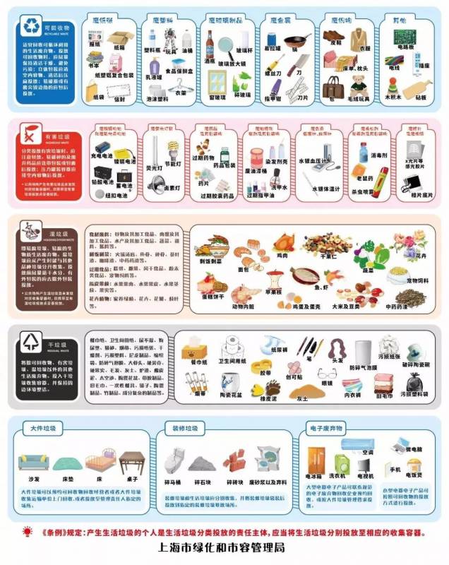 今年7月1日起新实施的《上海市生活垃圾管理条例》,要求所有人必须将垃圾按照可回收物、有害垃圾、湿垃圾和干垃圾这四个类别分类。要是不按照规定分类?罚款!