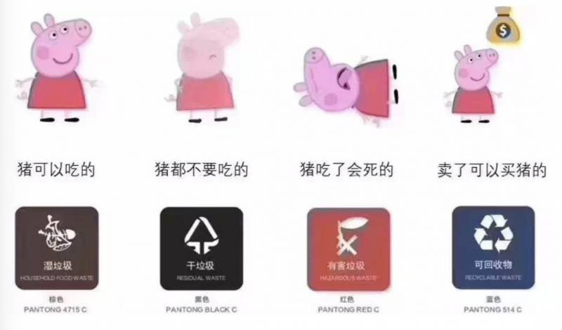 猪可以吃的,是湿垃圾;猪都不吃的,是干垃圾;猪吃了会死的,是有害垃圾;卖了可以买猪的,是可回收垃圾。
