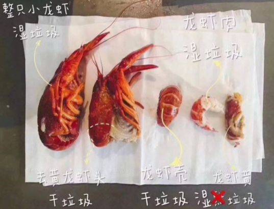 整只小龙虾属于湿垃圾,龙虾壳属于干垃圾,虾头里面的虾黄属于湿垃圾,去掉虾黄的虾头属于干垃圾……