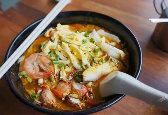 这是一个装修简单的餐厅,可以看到墙上贴满了老板和明星的合照,加东叻沙的特点是可以直接用勺子吃,因为米粉全都被剪碎了。这家店的Otah也很好吃,鲜嫩口感,再加上一杯薏米水或者酸酐水就十分完美了。