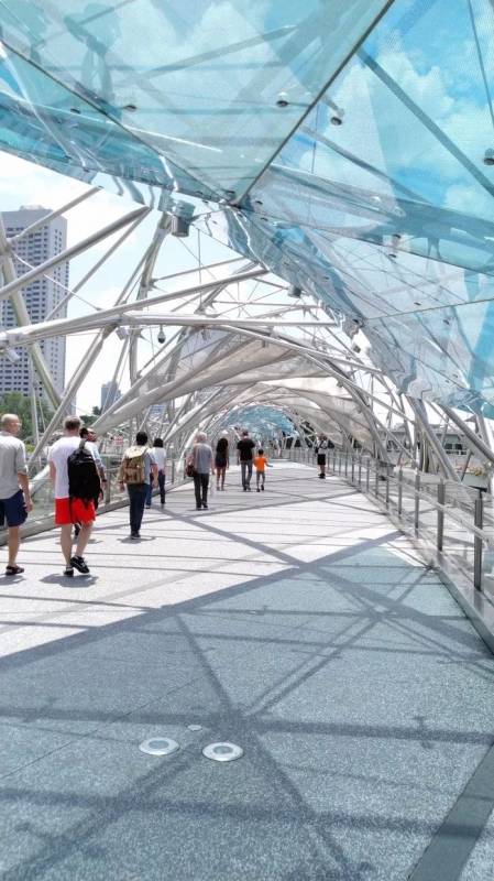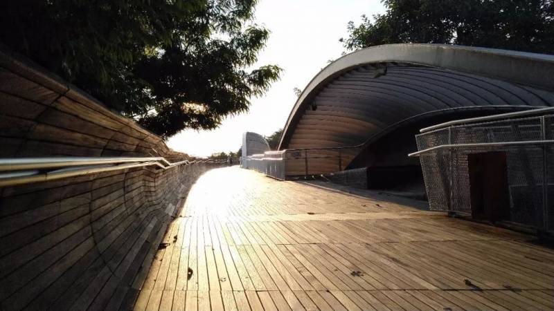 一个很花哨的景观桥,钢构的韵律感很强,结合灯光的效果,晚上非常漂亮,但由于没有完整的顶棚,所以白天并没有遮阳或者避雨的功效,纯粹是一个景观装置。