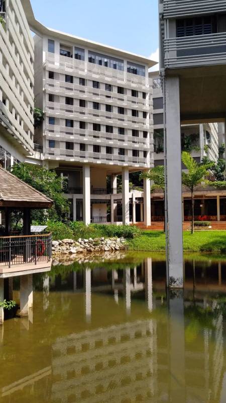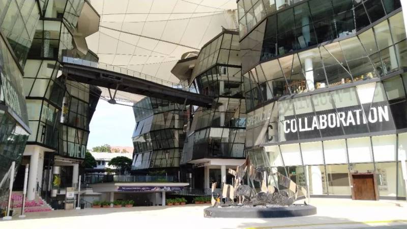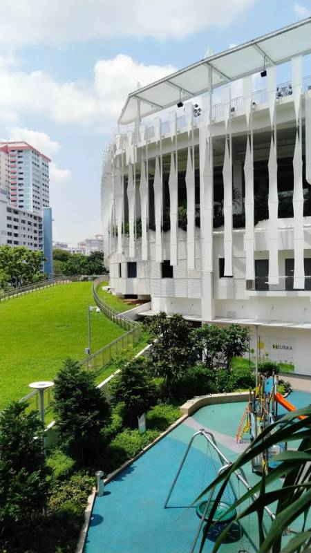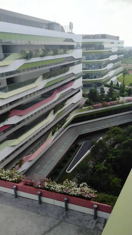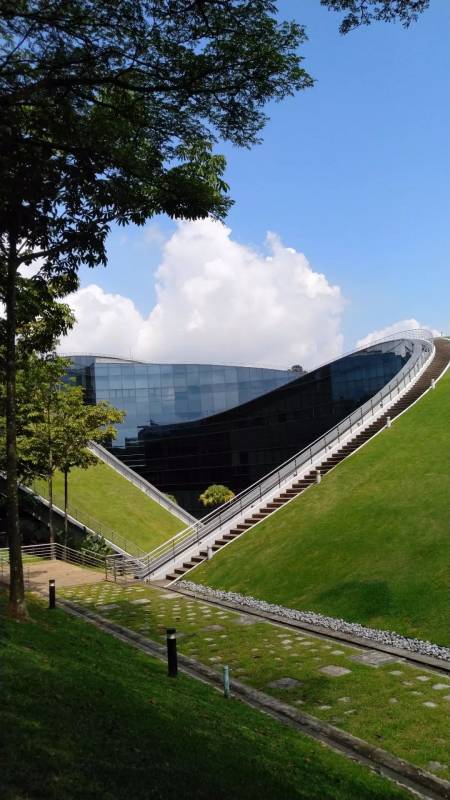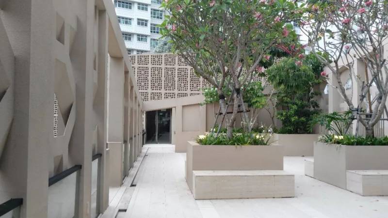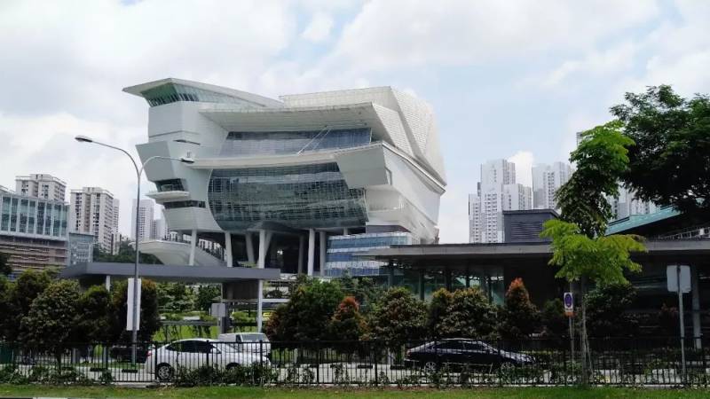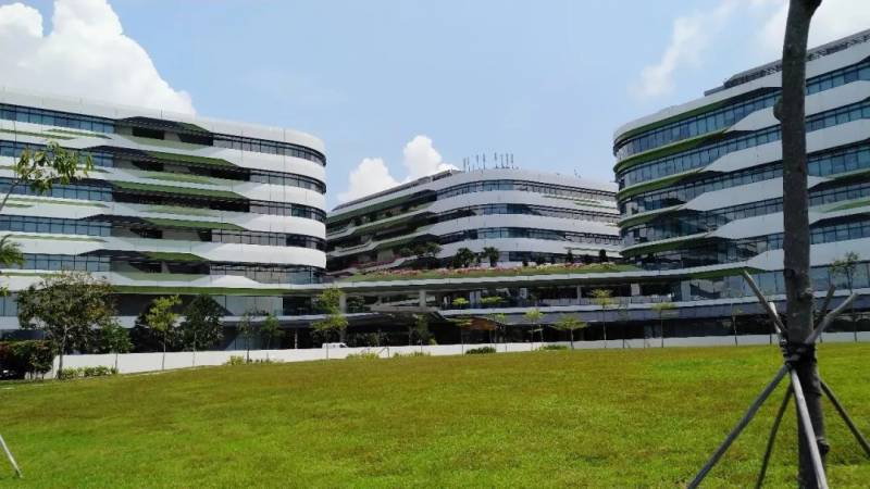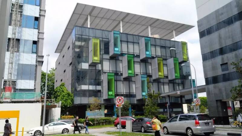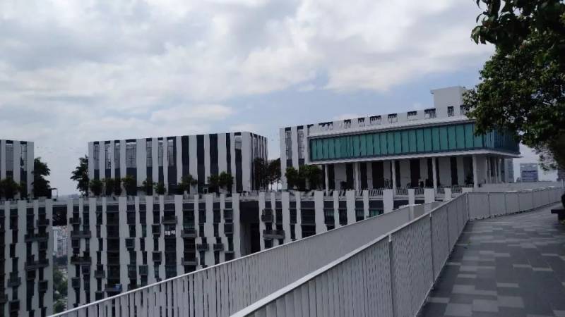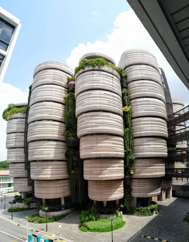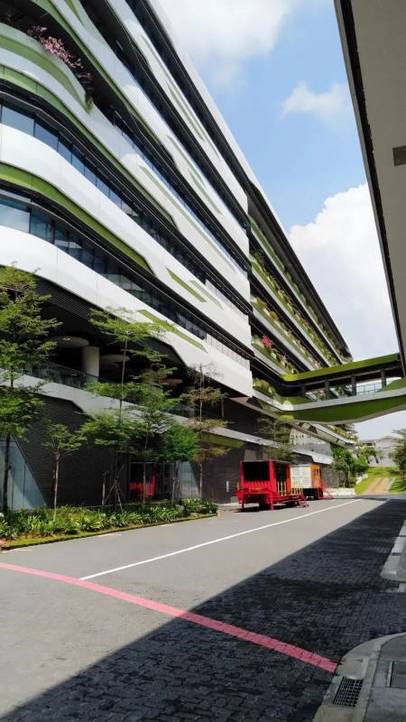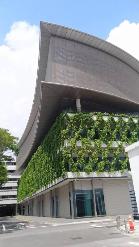 说来新加坡确实很小,很多大学都是是国内高中的尺寸像。像科技设计大学主要就是一整栋连在一起的教学楼,以及宿舍与运动场。科技设计大学在立面设计上比较年轻态,像集成电路一般的几何线条,配搭饱和度极高的红绿色彩,以及墙面山几种绿植搭配,确实很符合一所新建大学的气质。另外成龙在国内购买的几个小的古建也陈列在这里,有兴趣的同学可以看一下。
