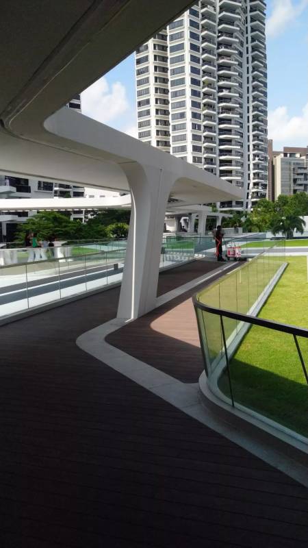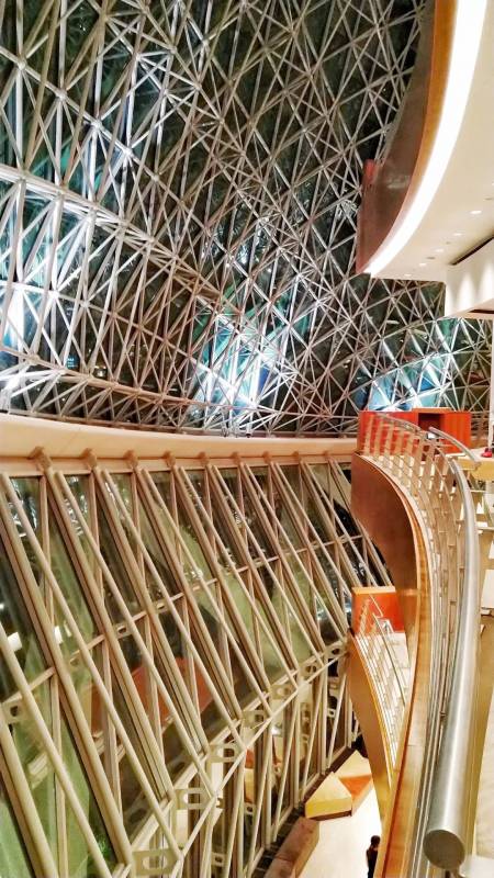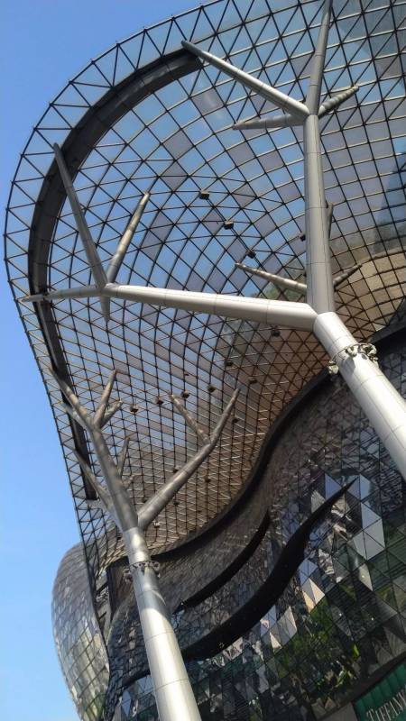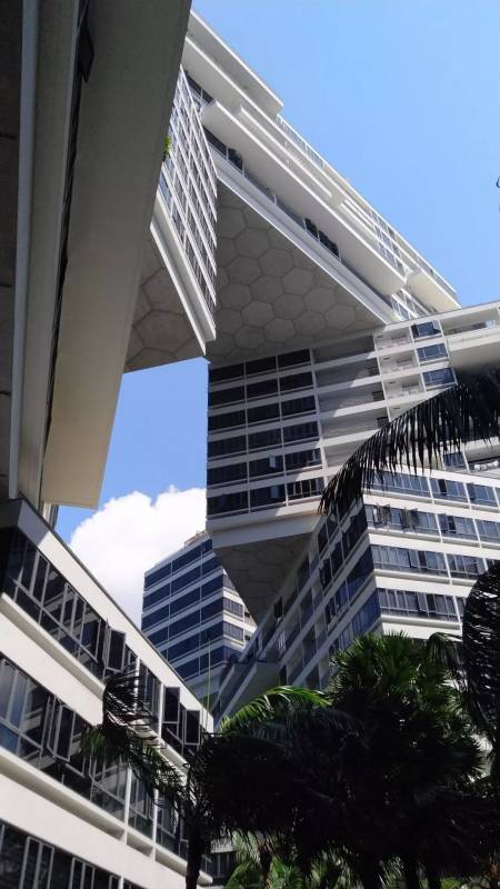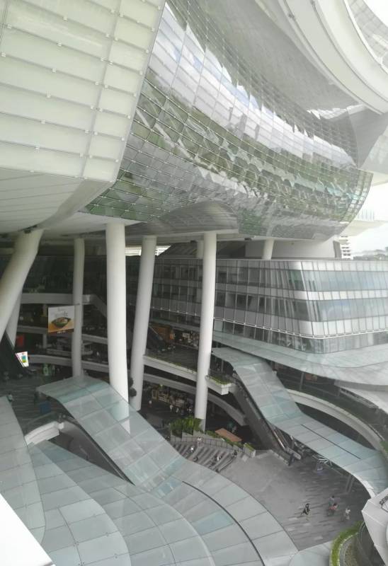 像榴梿壳的表皮可以说完美的结合了新加坡人民的一大爱好,产生了很强的话题感。不知是新加坡是空气比较好,还是清洁平凡,立面上面看起来非常干净(后来在高层上观察屋顶上的灰尘还是比较多)。内部的公共空间比较简洁,突出建筑外壳的结构感。