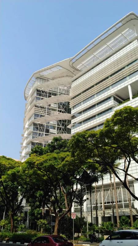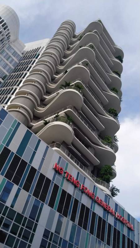 一座超大型绿色医院,建筑形象属于比较标准的方盒子造型,在外立面上几个层次的遮阳板品质感很高。但最值得夸耀的还是它在医院绿化以及微生态系统塑造上所作出的努力。和新加坡多数公共建筑一样,采用了一层架空开放的模式,同时在地下一层,一层以及群楼的顶层设置了较大面积的公共花园。顶层的花园主要供病人休憩散步,一层的花园则是为两侧的诊室以及餐厅提供森林般的休憩空间。而地下一层的花园则更多的是在利用生态水池来养殖大量的鱼类,同时布置了水景瀑布等作为观赏需要。经医院方面的统计,在生态水景内栖息的鱼类超过了一百种,同时医院院区内观察到的蝴蝶也达到了三十种。