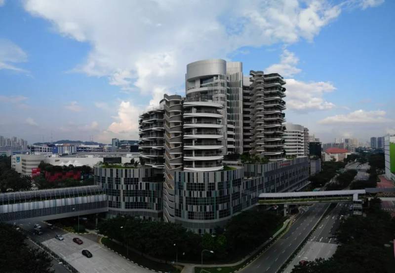 这其实是有三座医院组成的超大医疗综合体,曾获得新加坡最高级别的绿色建筑标志白金奖。医院的公共空间利用空中连廊与周边的几个商业综合体相连,同时连桥所在楼层也是对公众开放的食阁及商业空间。